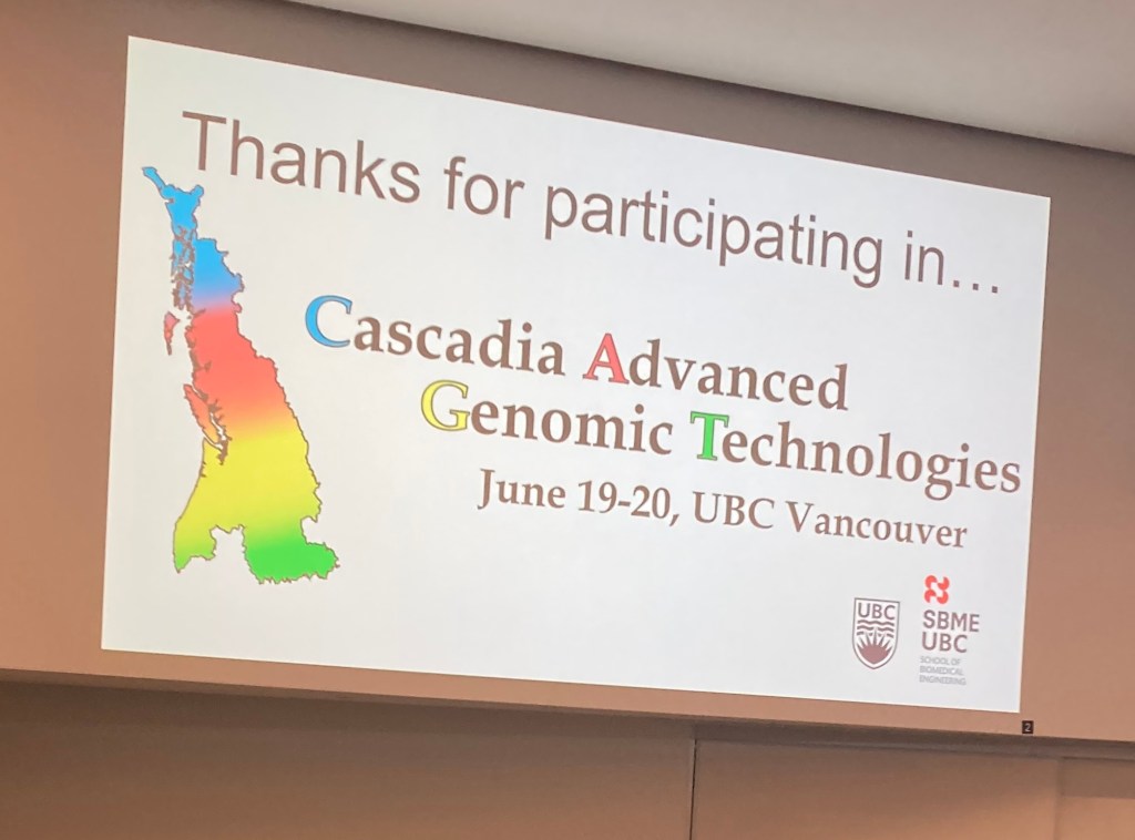 2025/06/19 – JB connects with prior colleagues and friends on the beautiful UBC campus at Cascadia Advanced Genomics Technologies meeting and presents his forthcoming work on deep and multi-scale phenotyping of mammalian developmental CREs using barcoded assays.