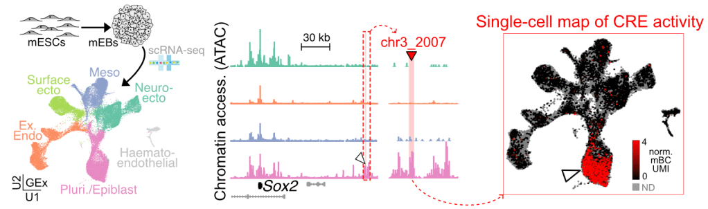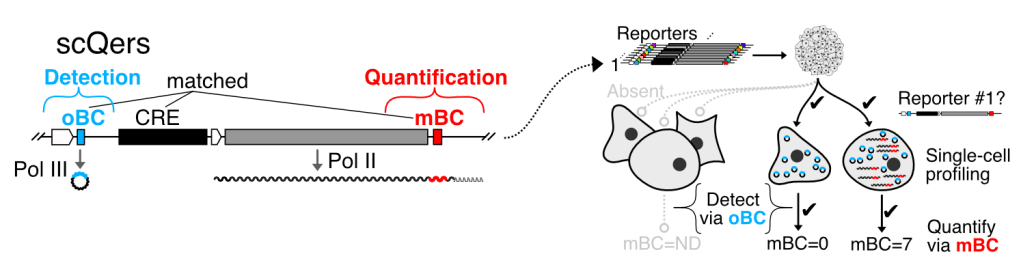 We were the first to combine single-cell RNA-seq and barcoded reporters to profile quantitatively the activity of distal CREs in complex multicellular systems. These ‘single-cell quantititative expression reporters’ (scQers) are currently being used to study gene regulation in a variety of in vitro and in vivo model systems. See the paper here, with a concise briefing explaining why we think this technology will be transformative for regulatory biology.
