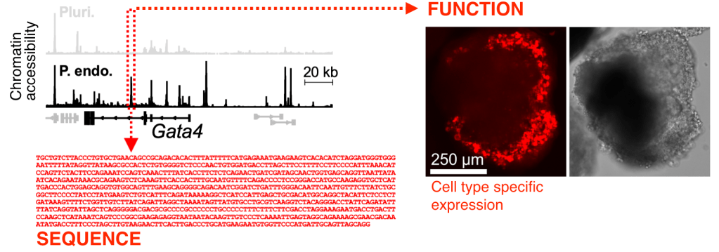 Molecularly, this exquisitely precise control on protein expression is dictated by genetic switches: fragments of non-coding DNA that recruit regulatory proteins which precisely turn genes on and off in development and disease. See an example below of a new endoderm-specific switch we discovered near the gene Gata4.
